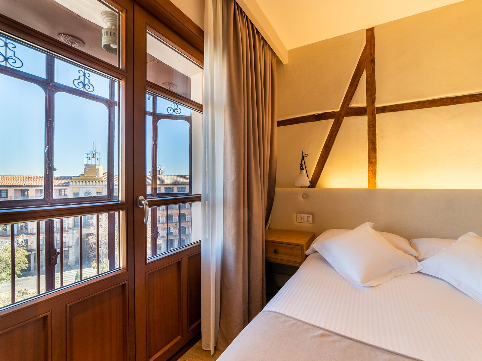 Con una decoración moderna y cálida, esta habitación dispone de una cama doble, balcón privado con vistas a la Plaza de Zocodover y un baño completo con ducha de hidromasaje. Disfruta de detalles pensados para tu bienestar, como minibar con agua y chocolates de cortesía, amenities ecológicos y un ambiente tranquilo perfecto para descansar tras recorrer la ciudad.